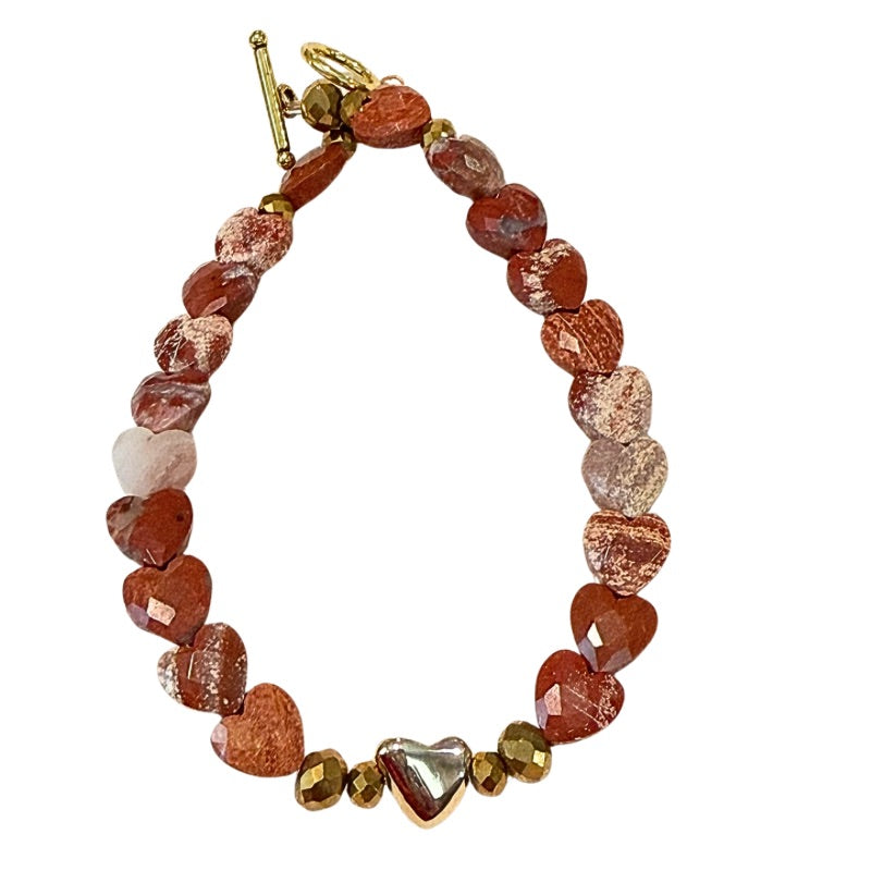 This Limited Edition Mindful Pebble Heart Bracelet features a bronze Mindful Pebble and a selection of vibrant faceted 8mm heart-shaped semiprecious gemstone beads.